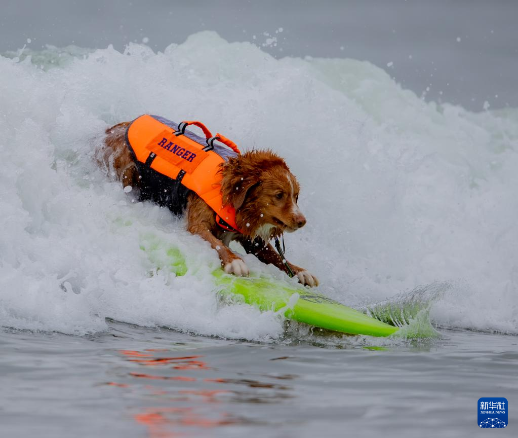8月6日,在美国加州旧金山湾区帕西菲卡,一只狗狗参加冲浪比赛。