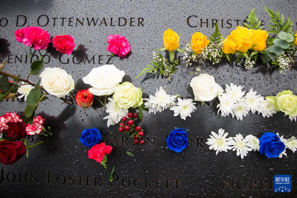 9月11日,在美国纽约的“9·11”纪念广场,鲜花摆放在纪念池边刻有遇难者姓名的铜牌上。