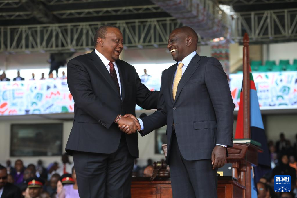 9月13日,肯尼亚当选总统威廉·萨莫伊·鲁托(右)在首都内罗毕举行的就职典礼上与第四任总统肯雅塔(左)握手。