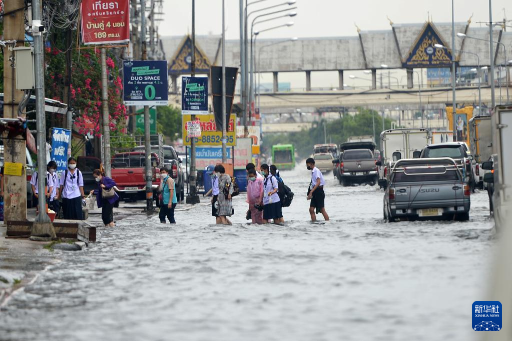 9月13日,在泰国曼谷,人们走过积水的街道。