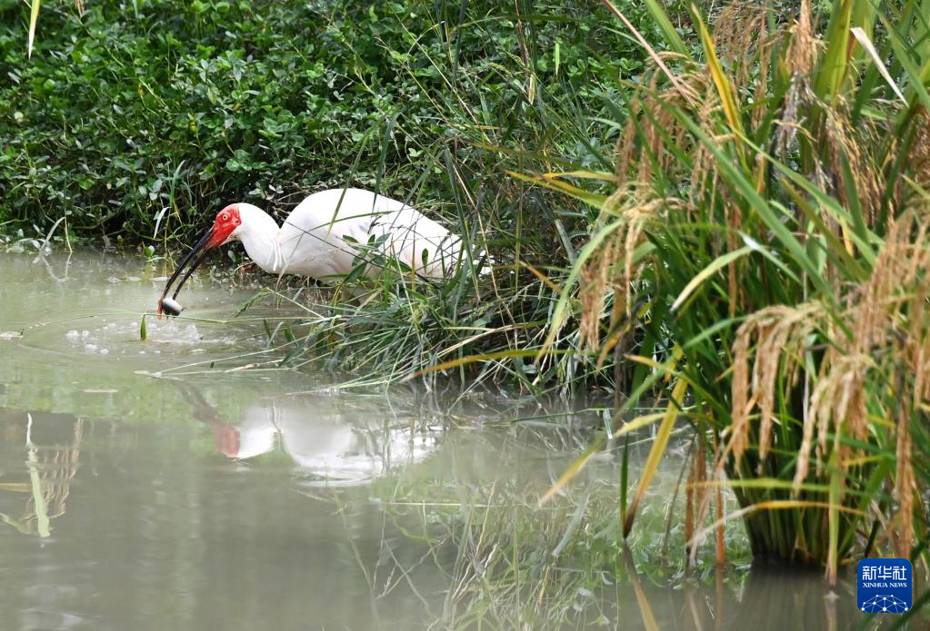 9月22日,一只朱鹮在洋县纸坊街道草坝村朱鹮保护区的稻田里觅食。