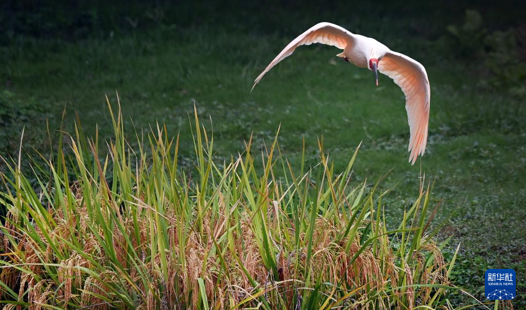 9月22日,一只朱鹮在洋县谢村镇的一片稻田中飞舞。