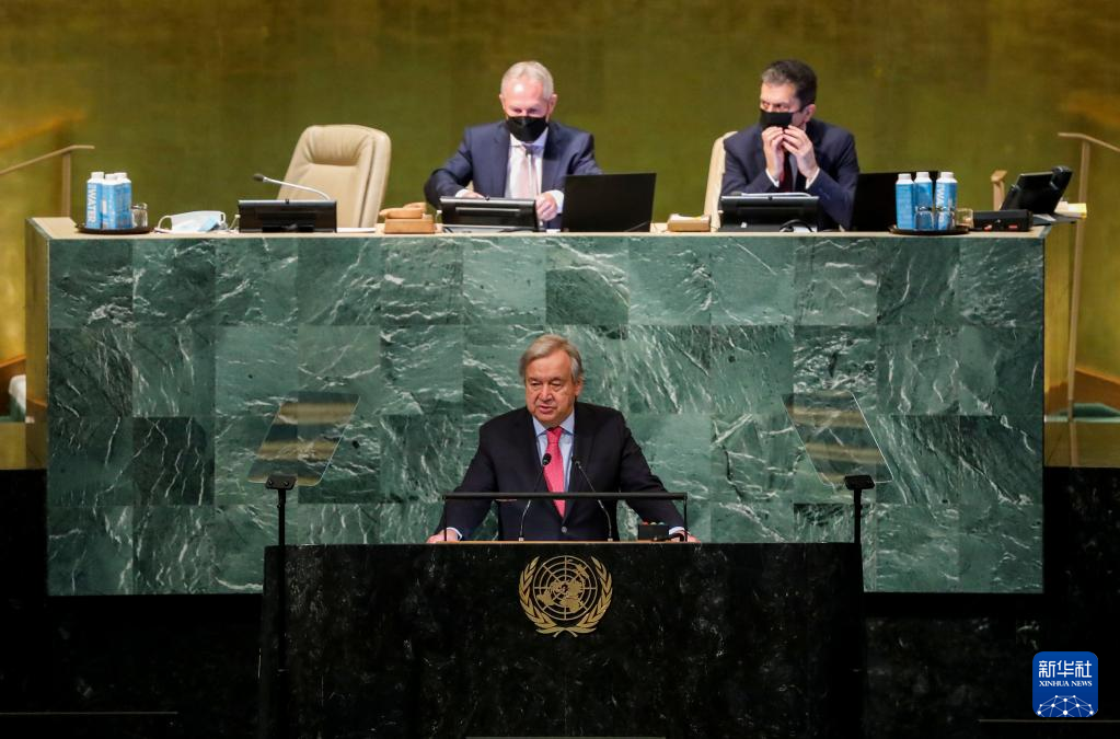 9月20日,在位于纽约的联合国总部,联合国秘书长古特雷斯(下)在联合国大会一般性辩论开幕式上讲话。
