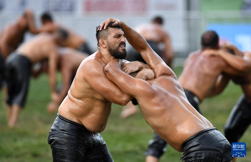 9月18日,选手们在土耳其伊斯坦布尔参加传统的橄榄油摔跤比赛。
