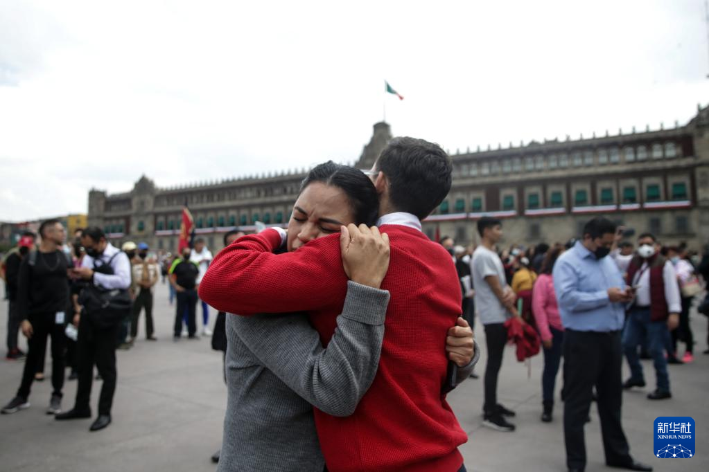 9月19日,在墨西哥首都墨西哥城,室外避险的人们相互安慰。