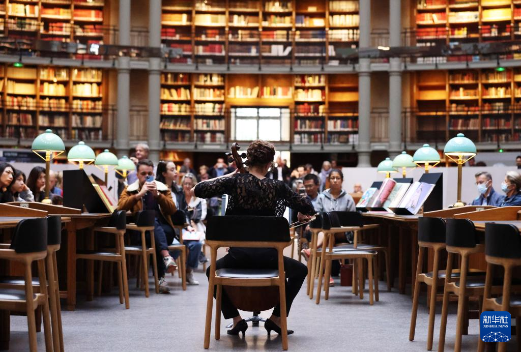 9月17日,在位于巴黎的法国国家图书馆黎塞留馆,人们在“椭圆大厅”聆听大提琴家的表演。