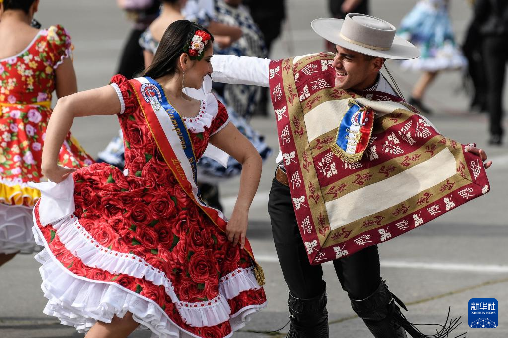 9月19日,在智利首都圣地亚哥,陆军节阅兵式开始前身着民族服装的舞者跳起传统舞蹈奎卡。