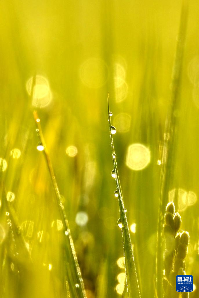 在浙江省诸暨市,稻谷上挂着水珠(10月1日摄)。