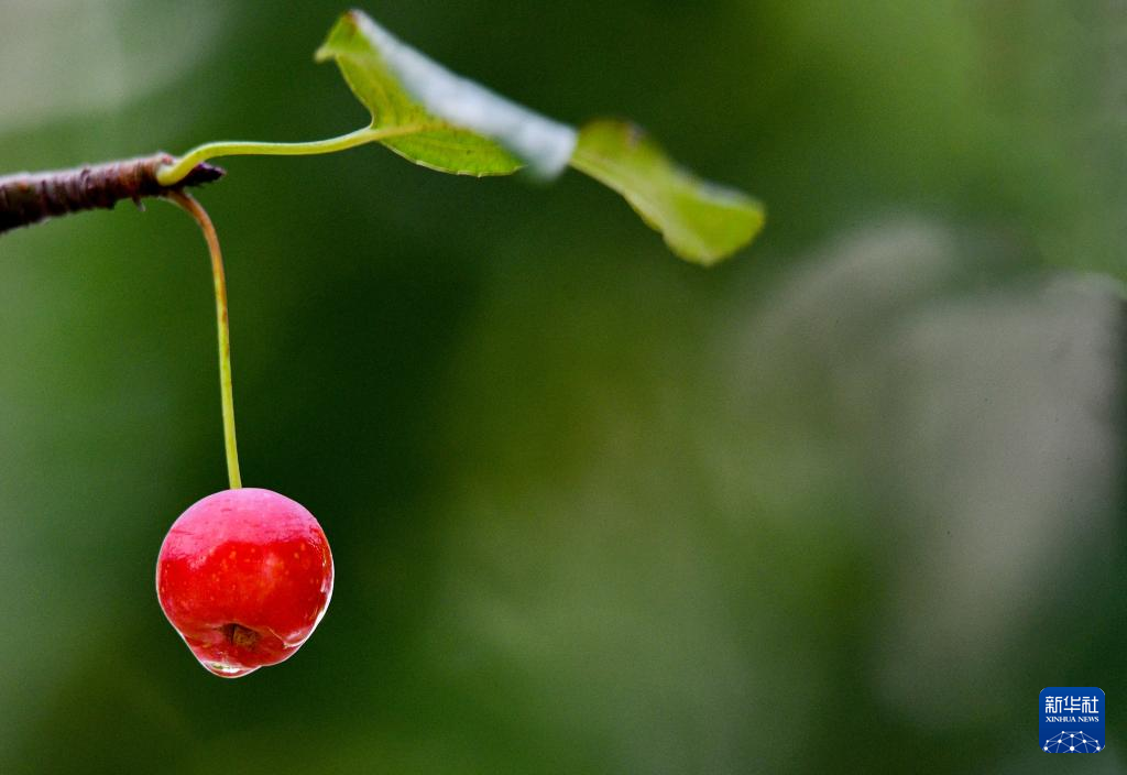 在河北省石家庄市,雨后的海棠果上挂着水珠(10月3日摄)。