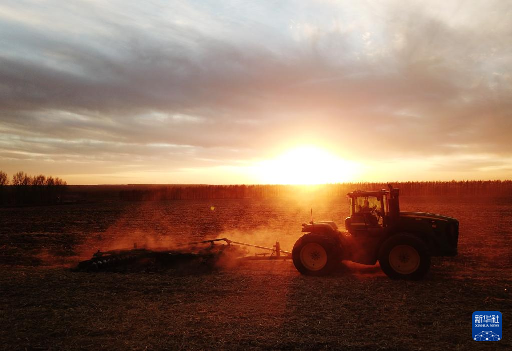 10月19日,在北大荒农垦集团有限公司北安分公司赵光农场有限公司,农机在一处耕地进行整地作业(无人机照片)。