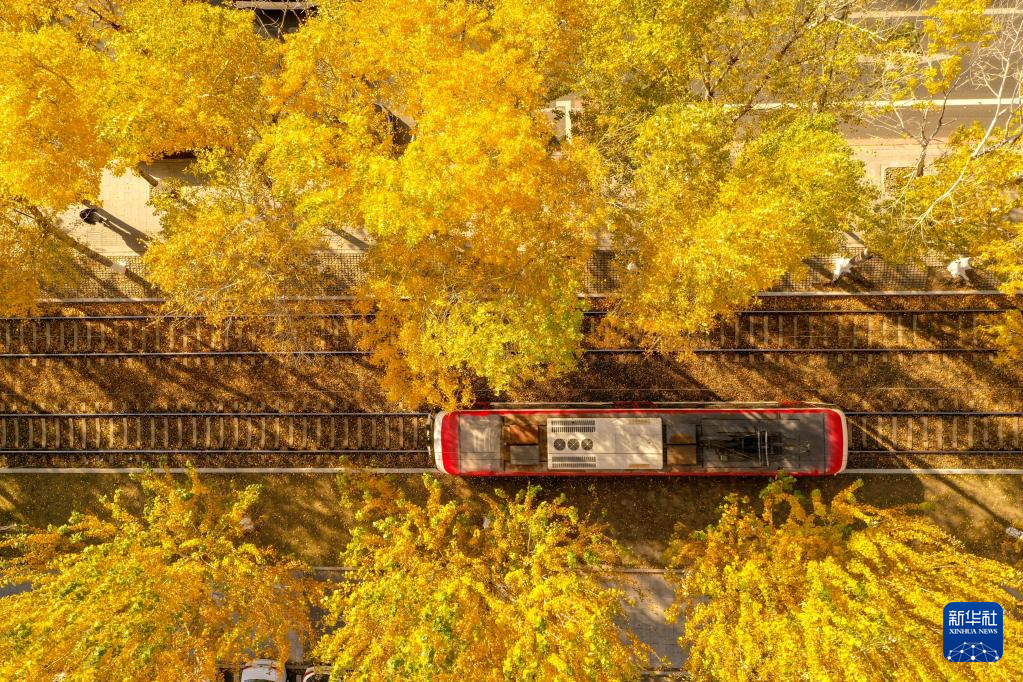 10月19日,在长春市春城大街,一辆电车行驶在轨道上(无人机照片)。