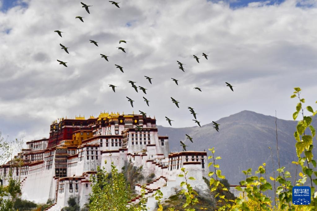 在西藏拉萨市,大紫胸鹦鹉在空中飞翔(10月9日摄)。