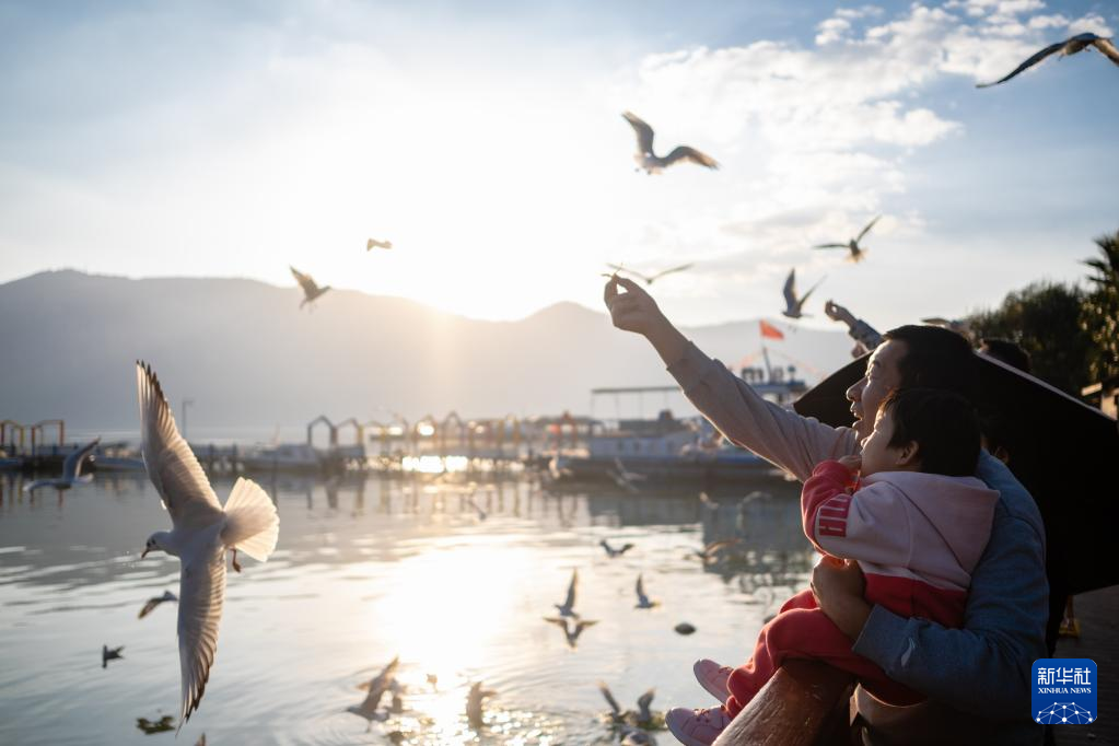 10月20日,市民在云南滇池畔投喂红嘴鸥。