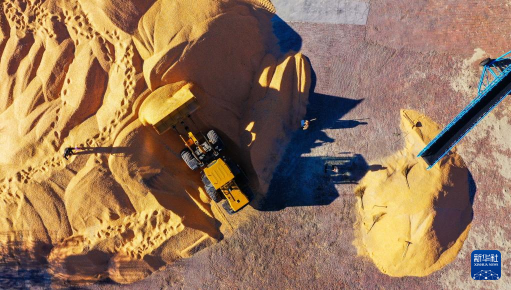 10月18日,在通辽市奈曼旗新镇舍布日图嘎查,工人在收粮站晾晒玉米(无人机照片)。