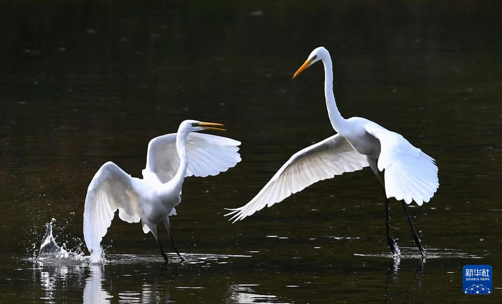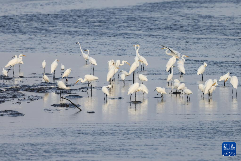 金秋时节,鹭鸟在山东省滕州市的荆河觅食、嬉戏(10月9日摄)。