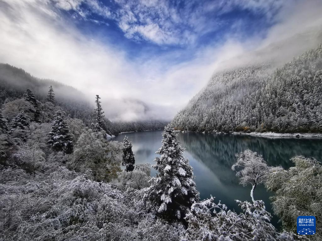 这是10月7日在世界自然遗产地九寨沟拍摄的雪后景色。