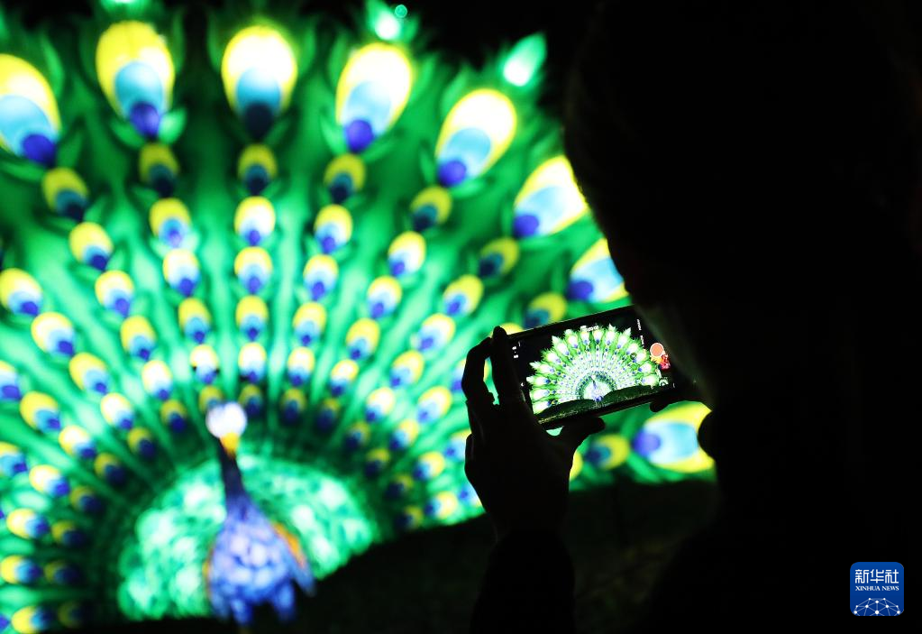 10月26日,参观者在法国图瓦里动物园灯展媒体预展上拍照。