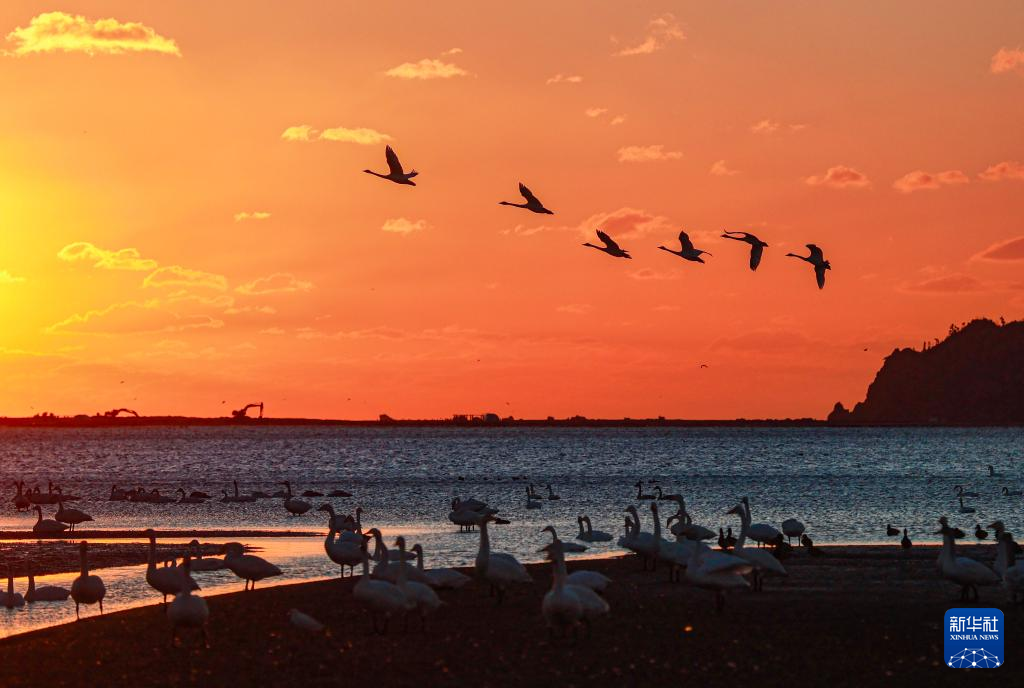 11月4日,山东省荣成市成山镇天鹅湖湿地,成群的大天鹅在栖息、飞翔。