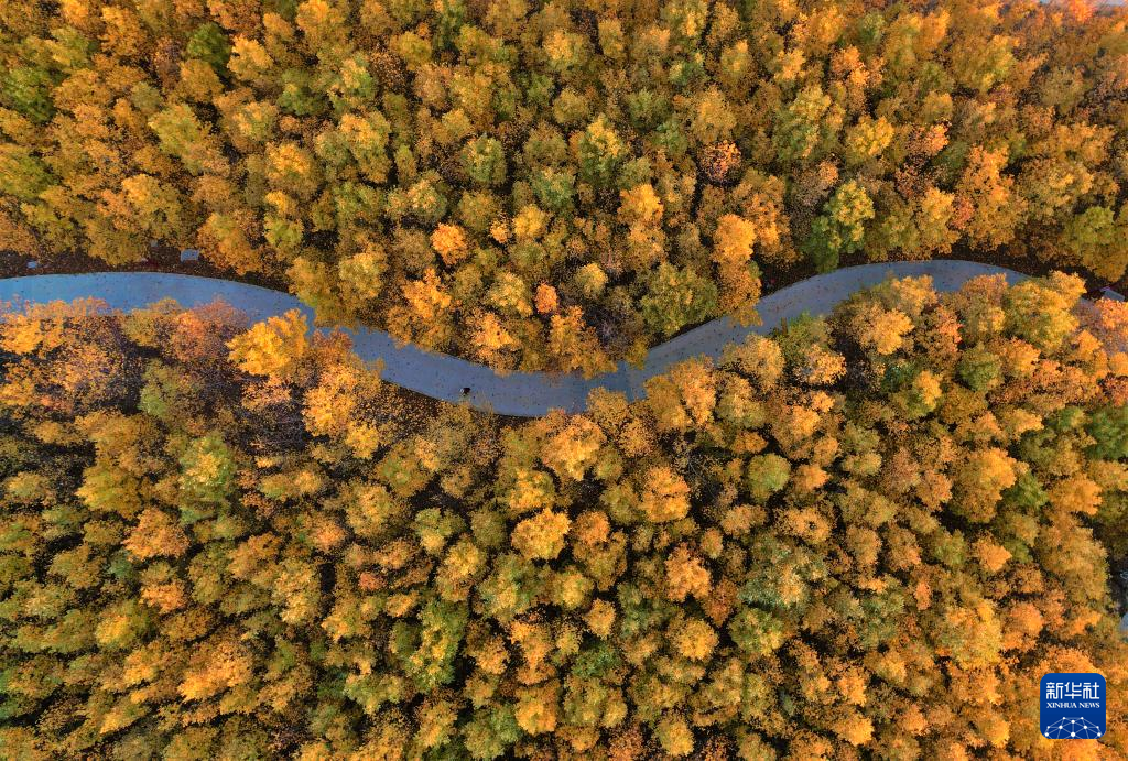 11月4日,市民在山东省威海市羊亭河湿地公园观赏秋叶(无人机照片)。