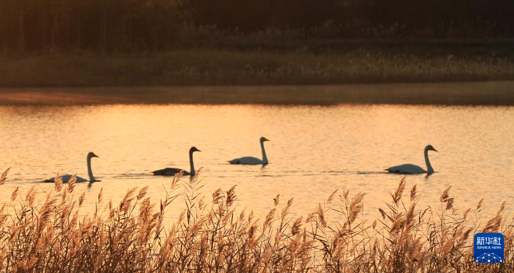 11月4日,几只白天鹅在甘肃省张掖国家湿地公园湖中栖息。