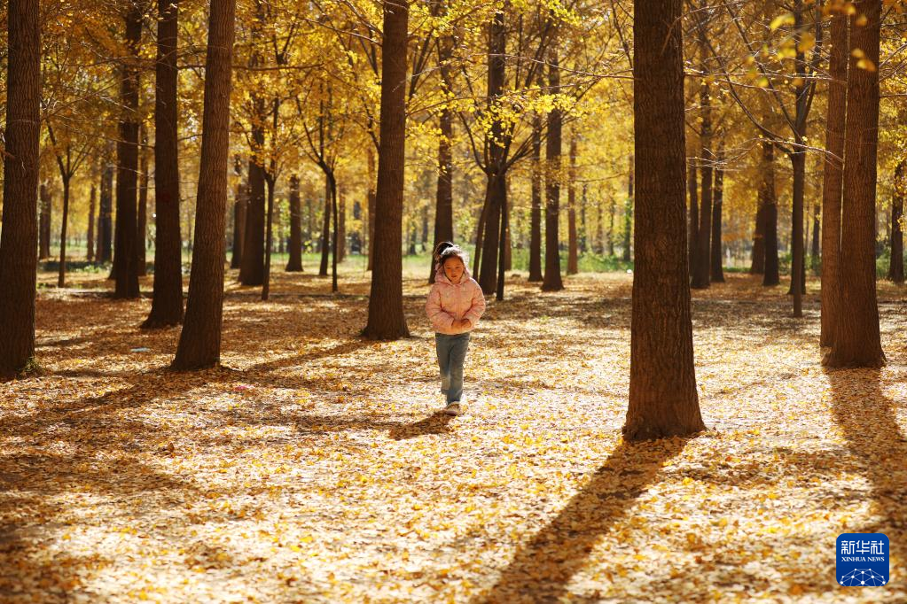 11月4日,小女孩在山东省临沂市郯城县胜利镇贾湾村银杏林中玩耍。