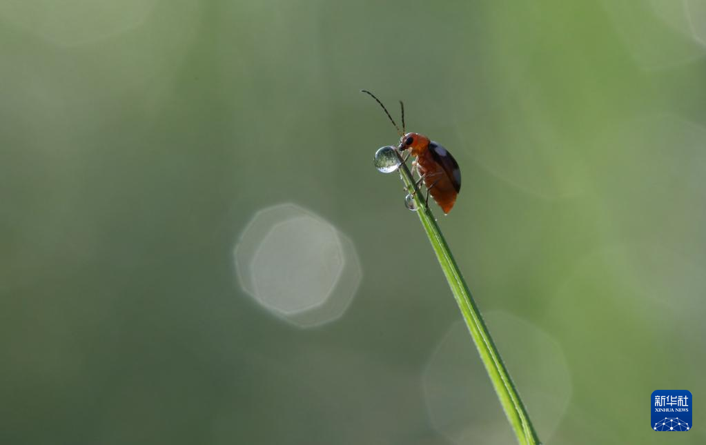 10月30日,在云南省景洪市,昆虫爬上草尖。