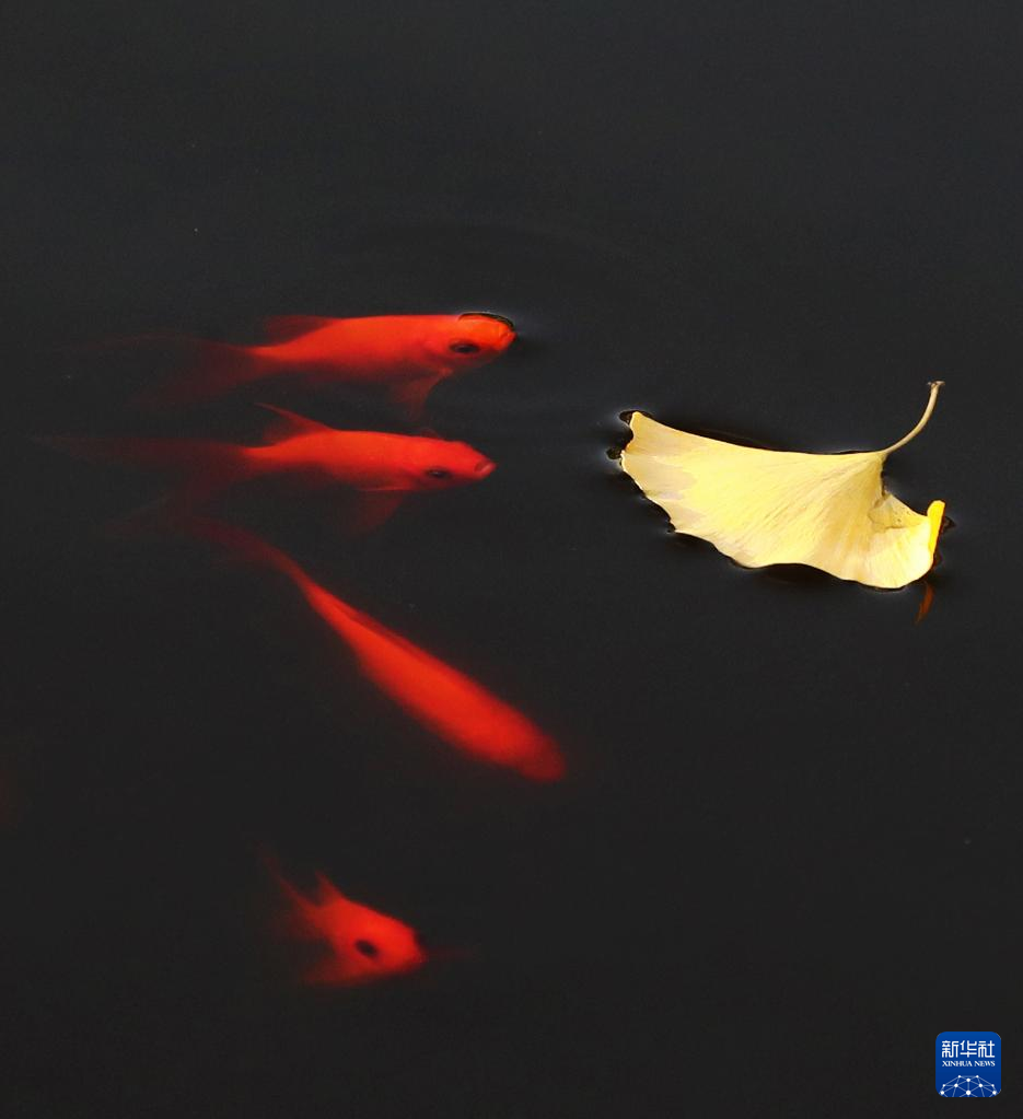 10月27日,在山东省滕州市西岗镇,一群锦鲤在银杏叶边游弋。