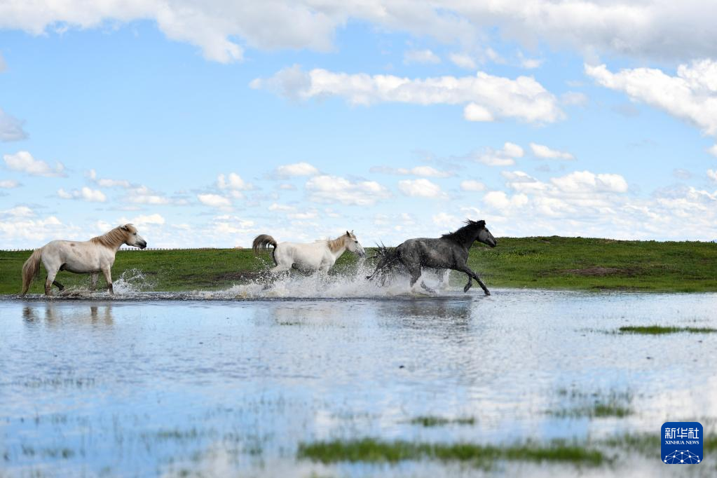 河曲马在甘肃省甘南藏族自治州玛曲县河曲马场的湿地奔跑(2019年6月22日摄)。