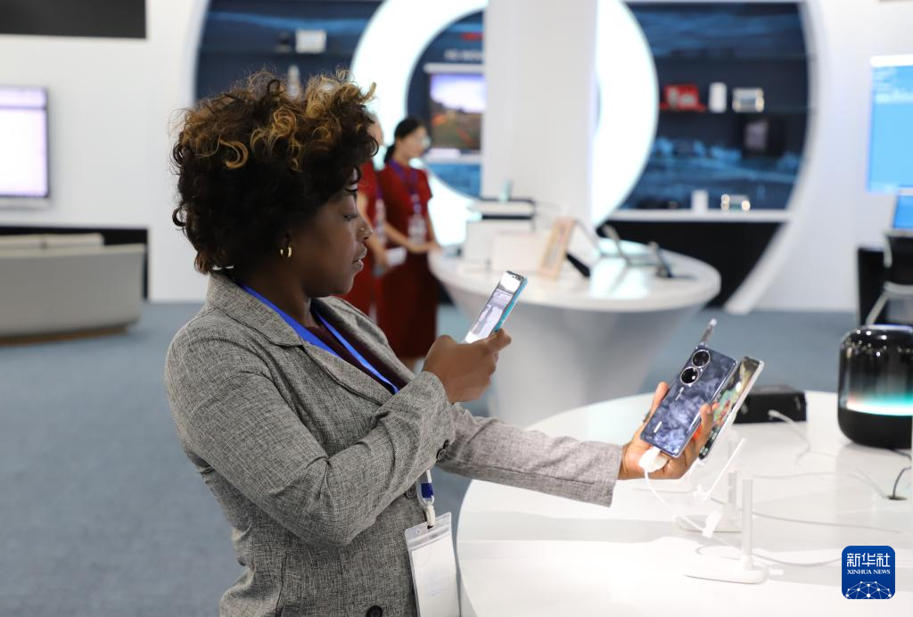 11月14日,在安哥拉罗安达的华为安哥拉科技园区,到访嘉宾拍摄华为手机产品。