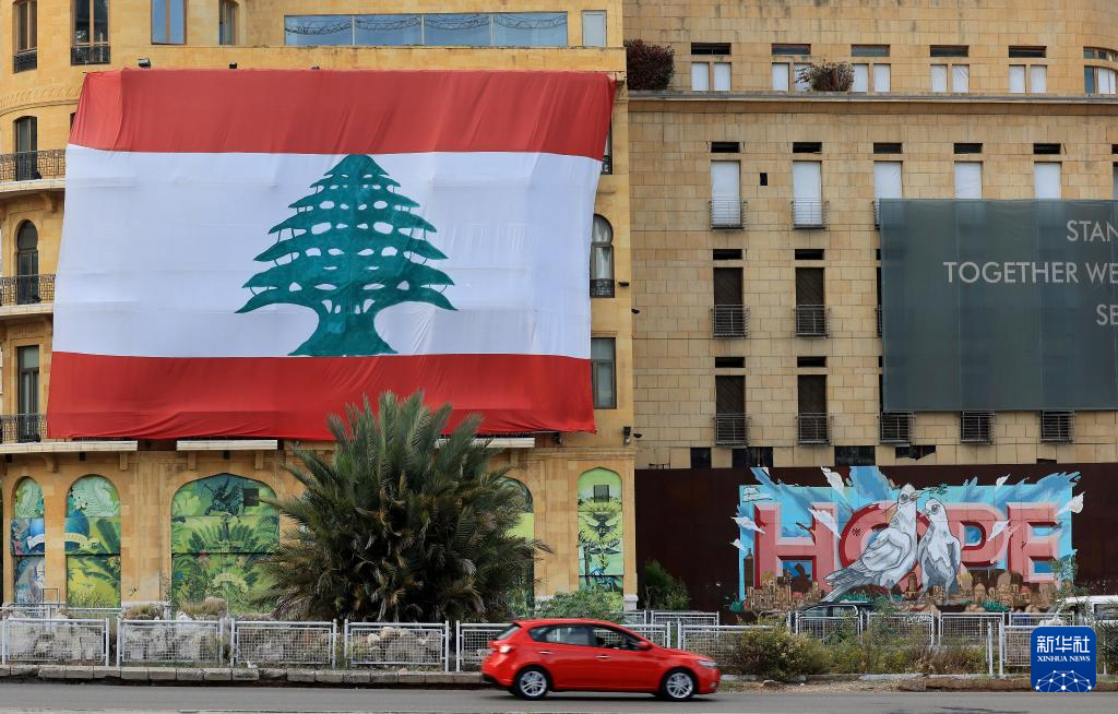 11月22日,一辆汽车驶过黎巴嫩首都贝鲁特街头悬挂的巨型国旗。