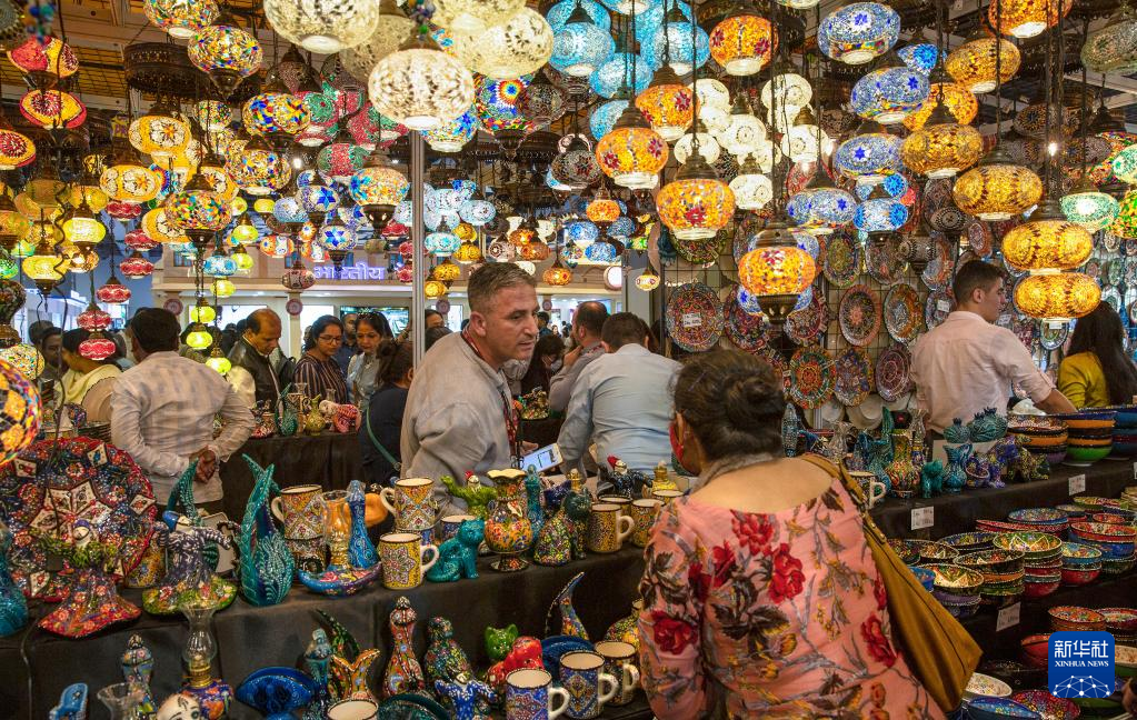 11月22日,人们在印度新德里的2022印度国际贸易展销会上购买特色工艺品。