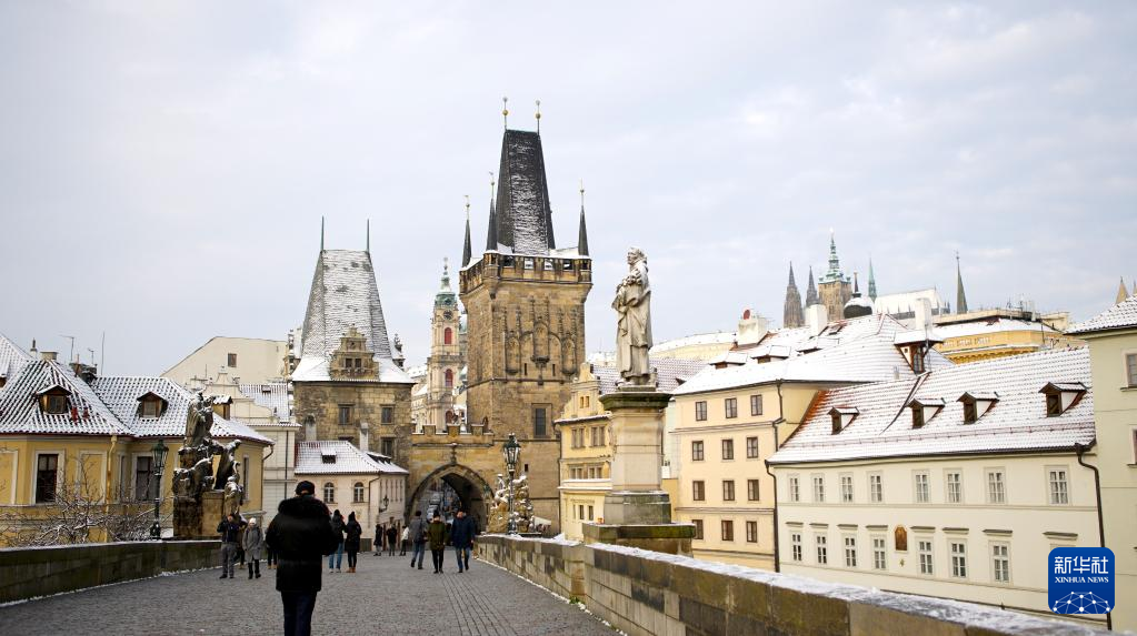 这是11月19日在捷克首都布拉格拍摄的雪后的查理大桥。