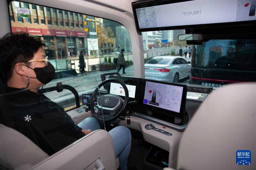 11月24日,在韩国首尔,自动驾驶巴士的安全员坐在驾驶室观看显示屏。