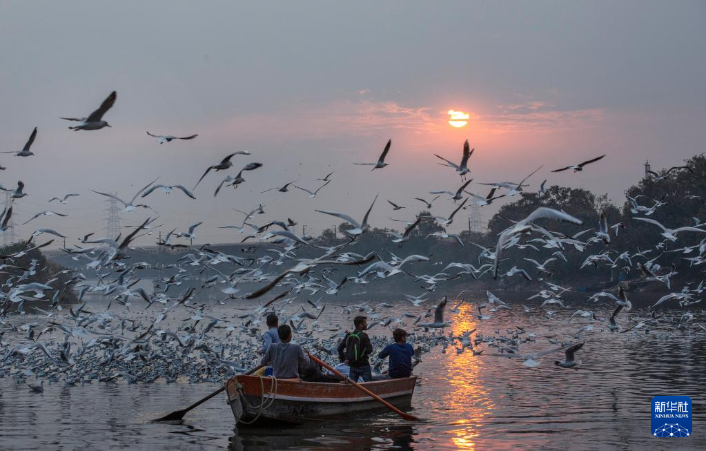 11月15日,候鸟在印度新德里亚穆纳河上飞翔。