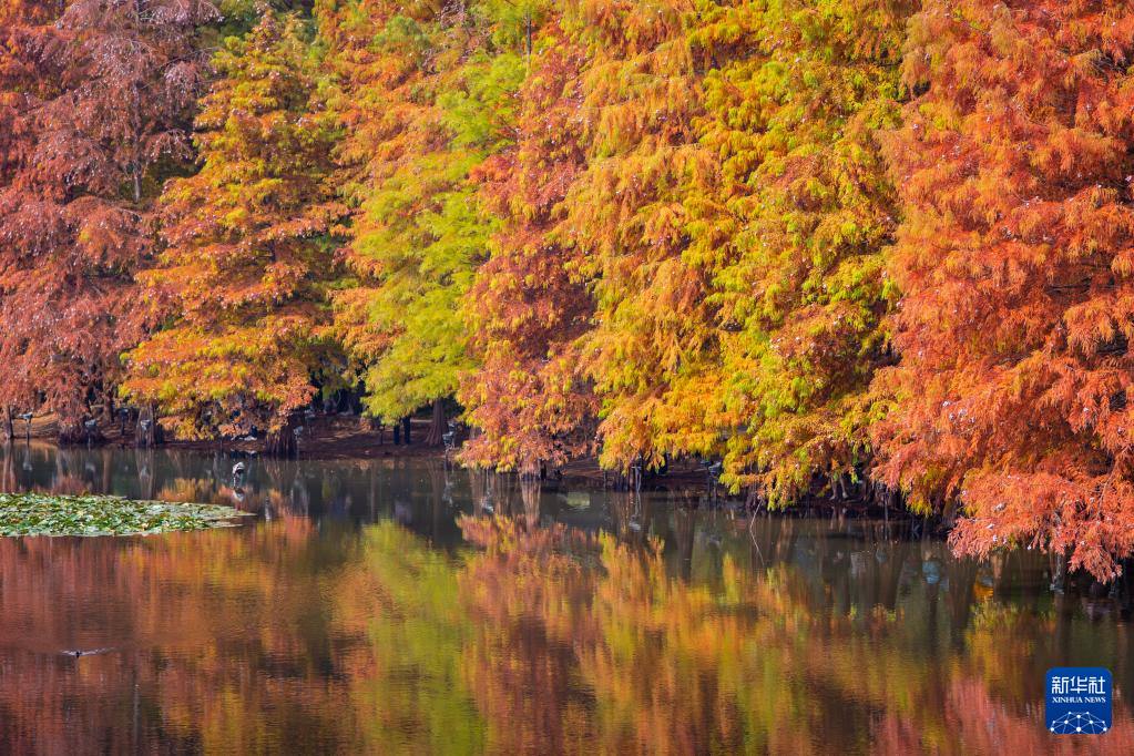 初冬时节,南京明孝陵景区燕雀湖畔的杉树林色彩斑斓,美如画卷。