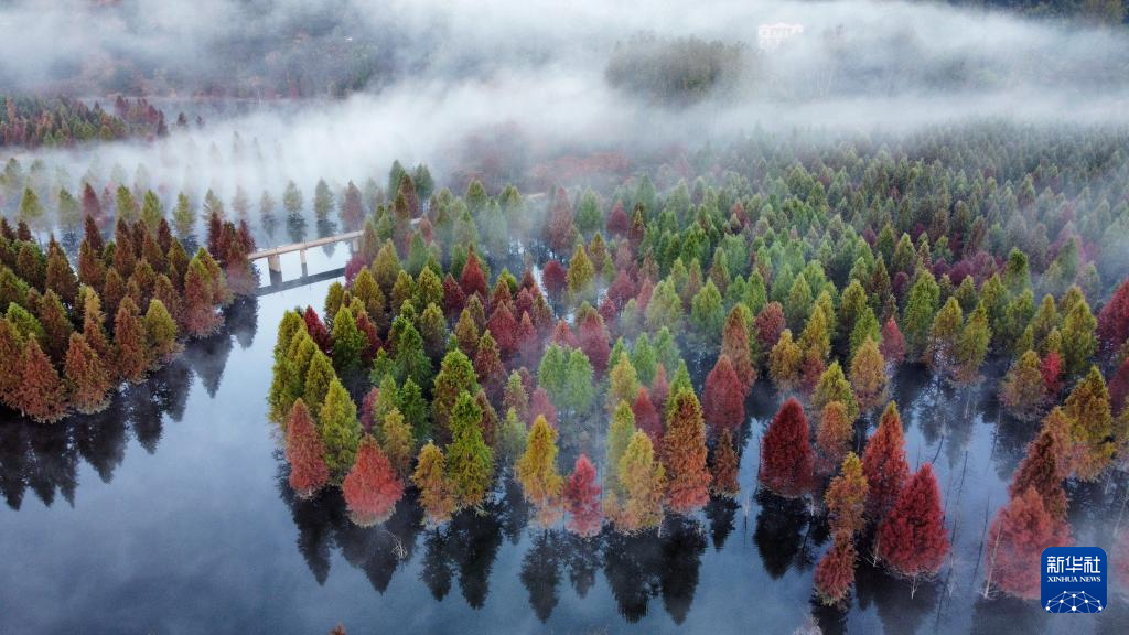 近日,云南省昆明市盘龙区滇源街道甸尾村水杉湿地的水杉林色彩艳丽,景色如画。