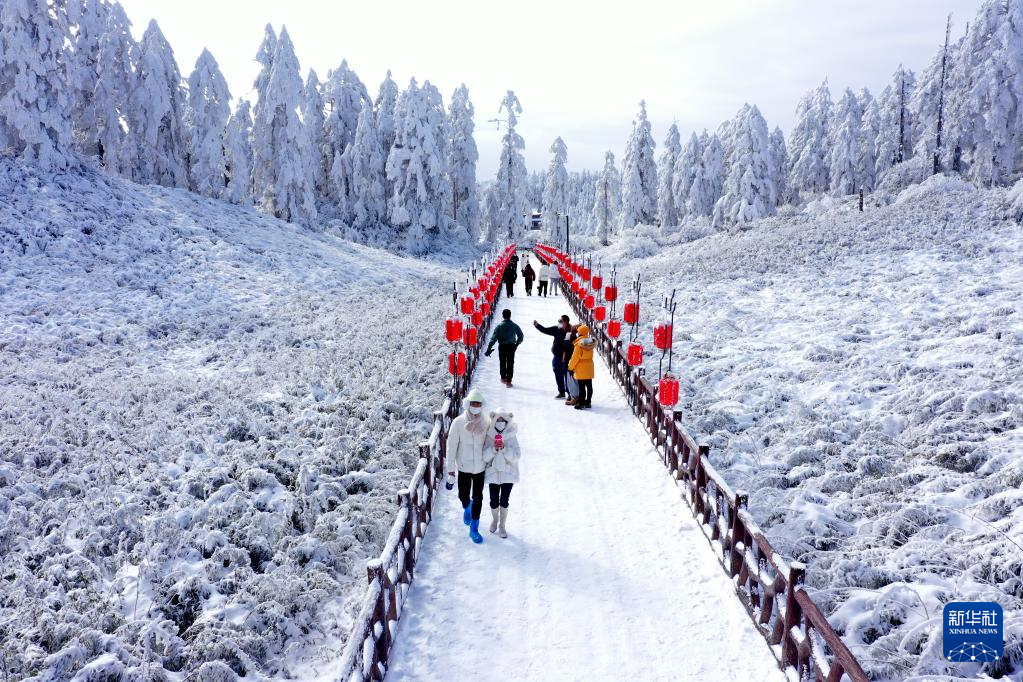 12月18日,游客在瓦屋山游玩赏雪(无人机照片)。