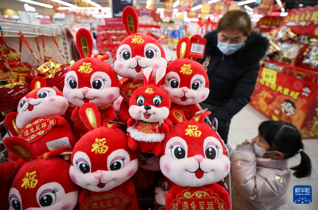 1月10日,江苏淮安市民在超市挑选生肖兔玩具。