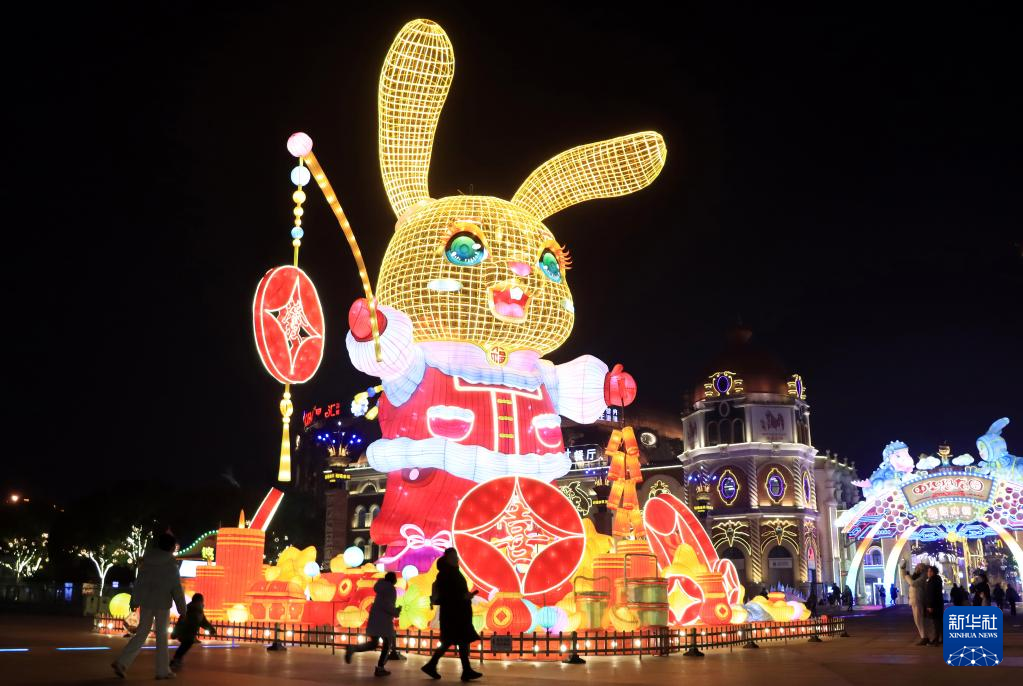 1月9日,在江苏省常州市,市民在“2023常州灯会”现场观赏巨型生肖兔灯。