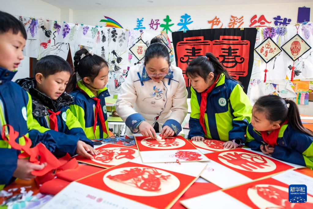 1月10日,安徽省芜湖市繁昌区繁阳镇城关一小师生在创作剪纸作品。