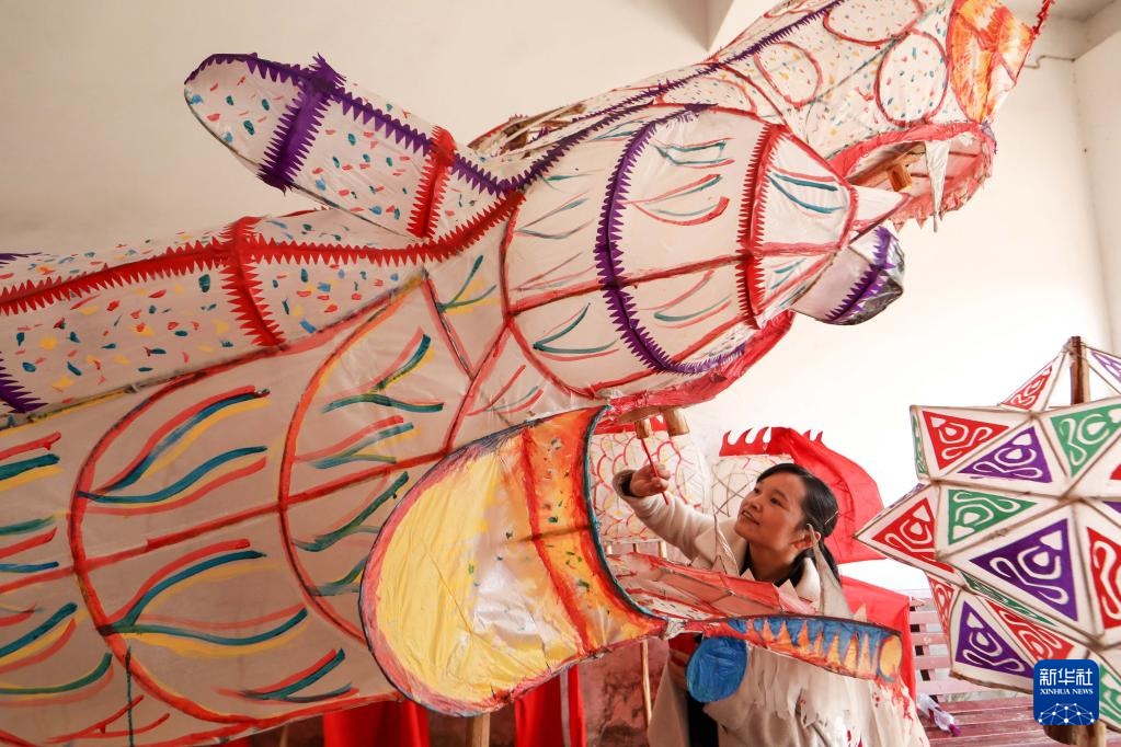 1月9日,村民在贵州省黔东南苗族侗族自治州岑巩县水尾镇新场村绘制龙灯。