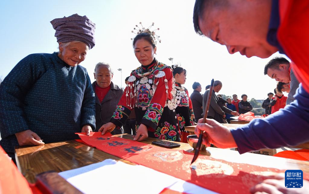 1月9日,志愿者在贵州省铜仁市松桃县正大镇麻塘村为群众书写春联。