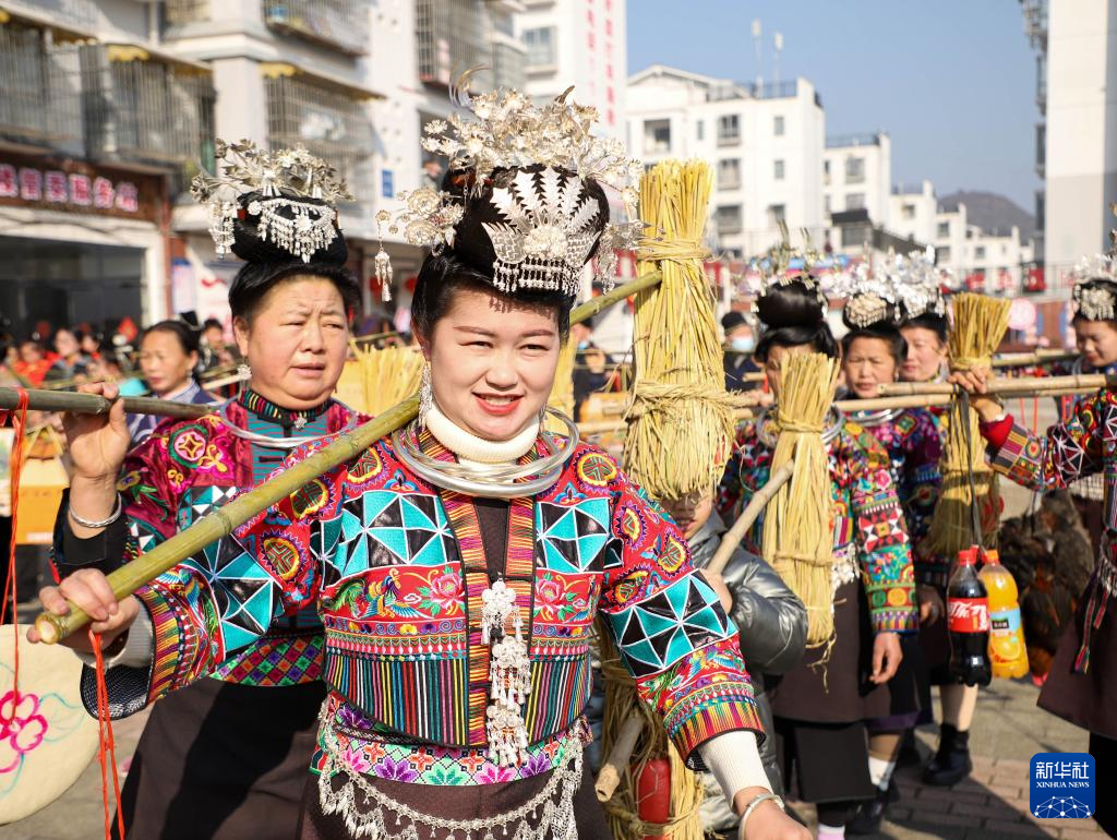 1月9日,在贵州省丹寨县金泉街道移民安置社区,身着节日盛装的苗族群众参加民俗展示巡游活动。