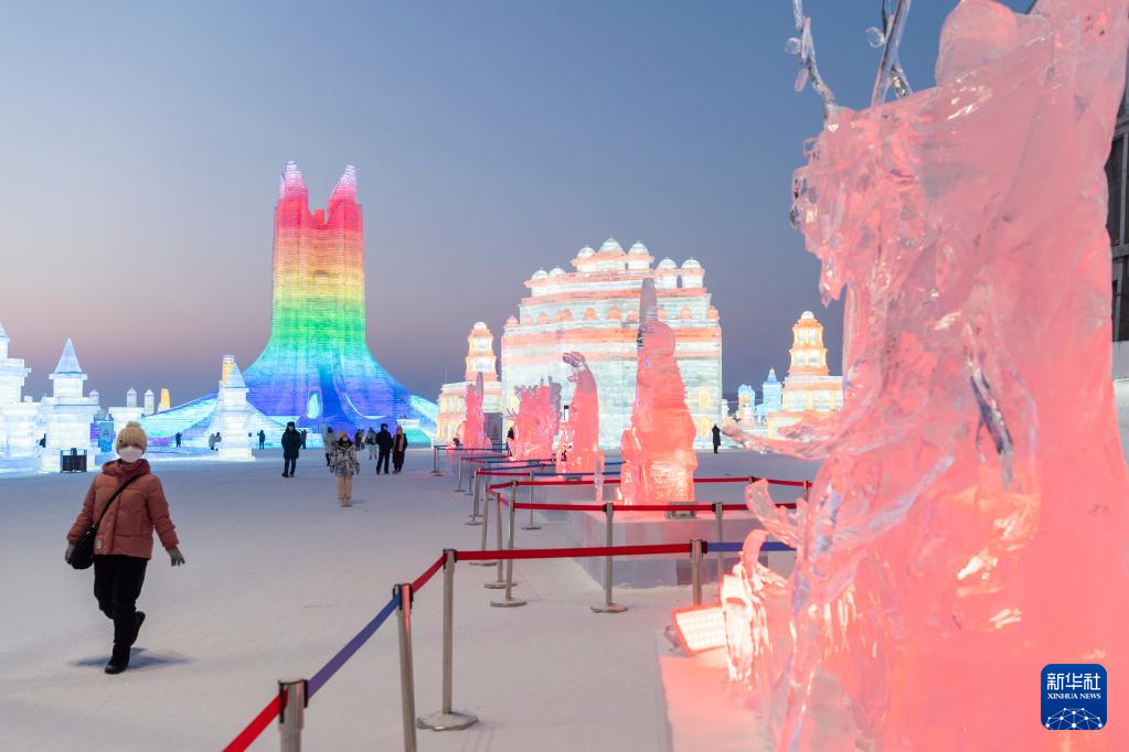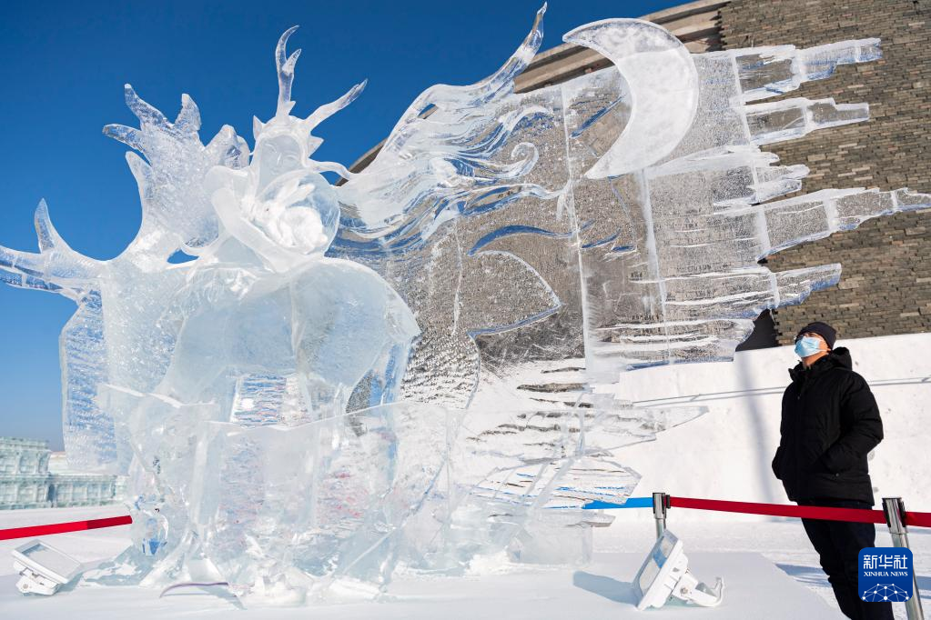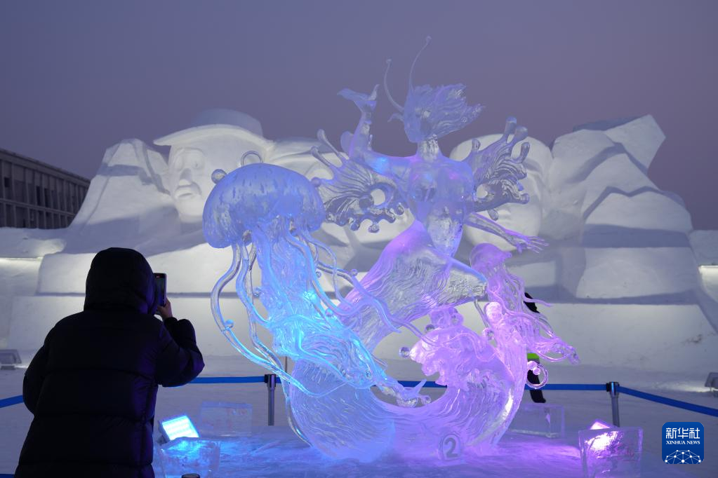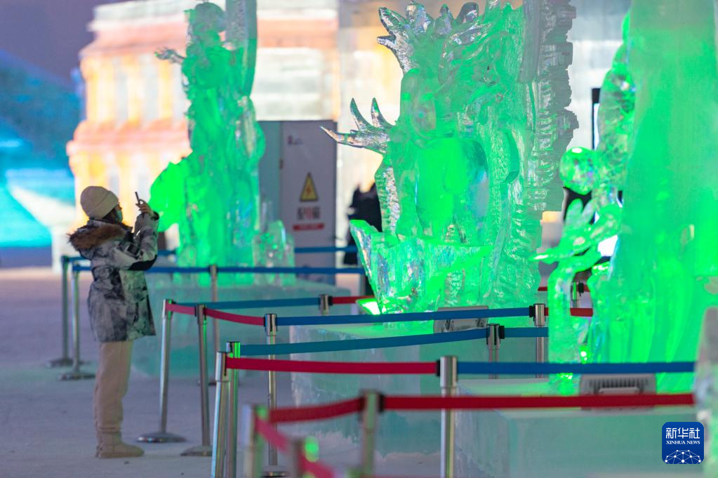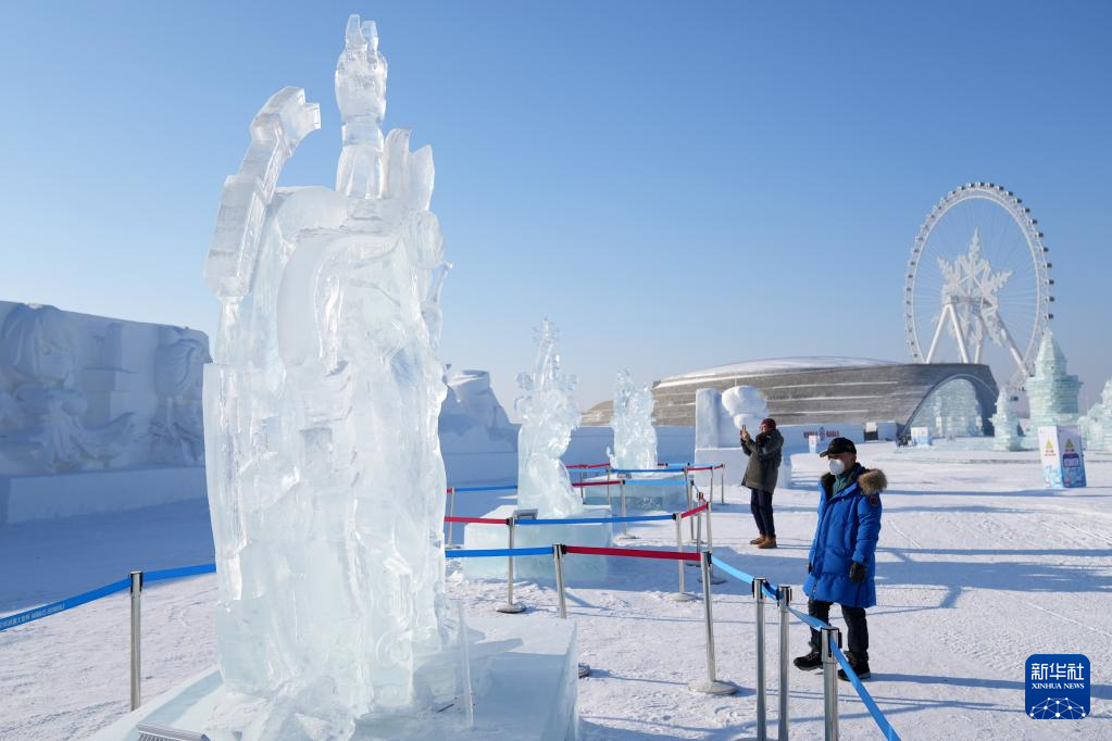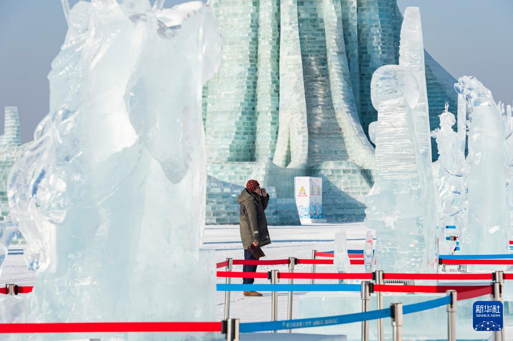 1月5日,游客在哈尔滨冰雪大世界园区欣赏冰雕作品。