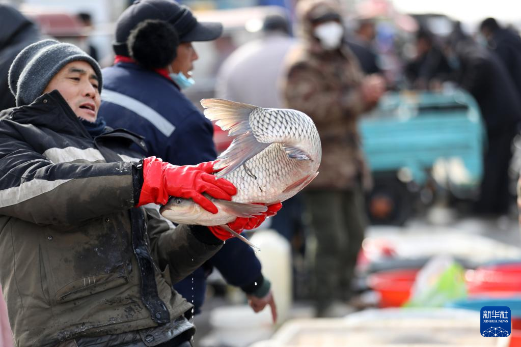 1月15日,在山东省临沂市郯城县郯城街道十里年集上,一名摊主在为顾客选取鲜鱼。
