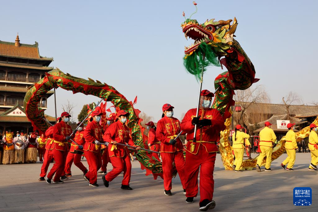 1月30日,在山东省枣庄市台儿庄古城,民间艺人在表演舞龙。