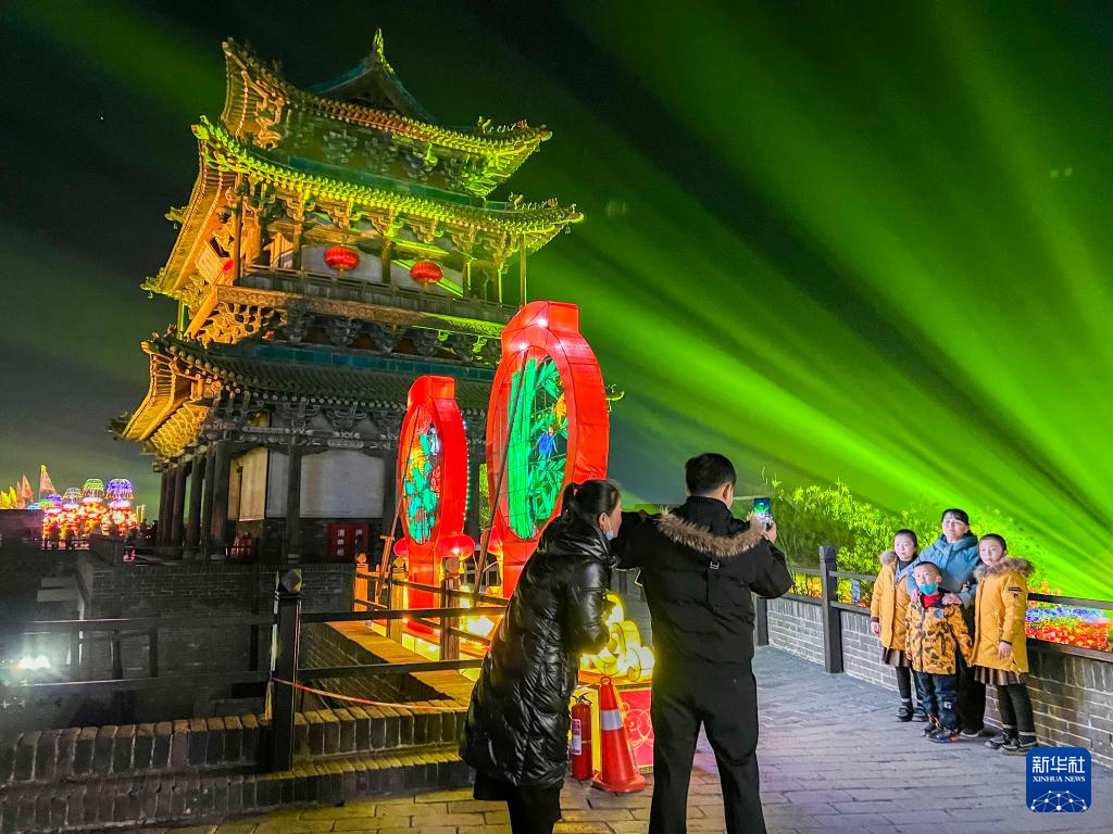 1月29日,游客在山西省晋中市平遥古城的灯光秀前拍照留念。