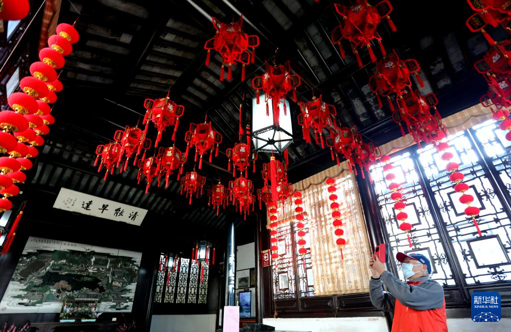 1月30日,一名游客在江苏苏州网师园拍摄喜庆花灯。
