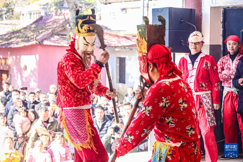 1月29日,在江西省抚州市南丰县莱溪乡黄满村,傩舞艺人在表演傩舞。