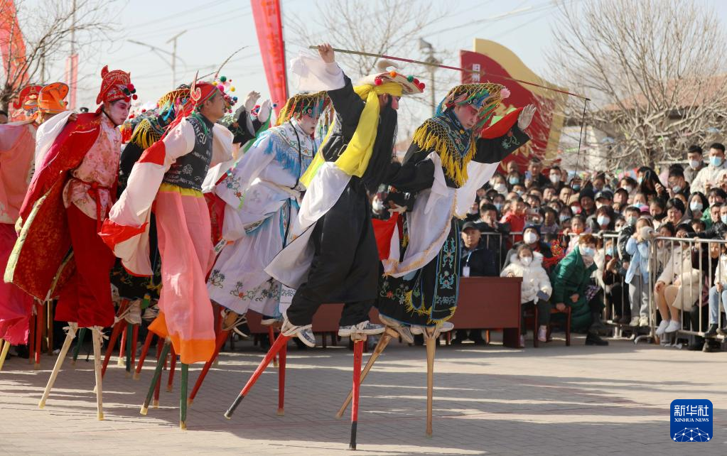 1月29日,在河北省沧县旧州镇贾村,民俗艺人在表演踩高跷。